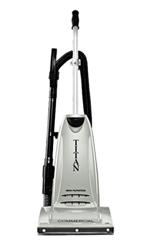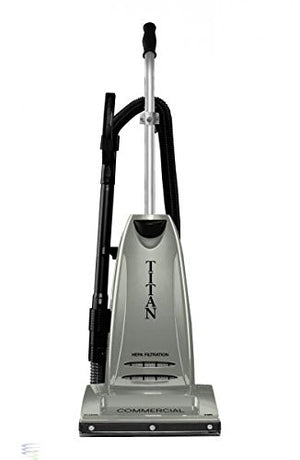 Titan TC6000.2 Commercial Upright Vacuum Cleaner. The Titan TC6000.2 commercial upright vacuum cleaner has a powerful 10 amp heavy duty commercial motor. This vacuum comes with on board tools and a telescopic wand with a handle that extends to cleaning easier in shelves, corners, and hard to reach areas. The HEPA media filter of Titan TC6000.2 Upright Vacuum captures dust, dirt and other allergens. Features: 10 amp motor, telescopic metal wand, metal brushroll, bottom plate, handle and cord hook, HEPA filtration, onboard tools, riveted bumper guard, suction relief valve, thermal reset button, metal pivot point, 40 foot cord, 1 year warranty. SC-17-4730-00